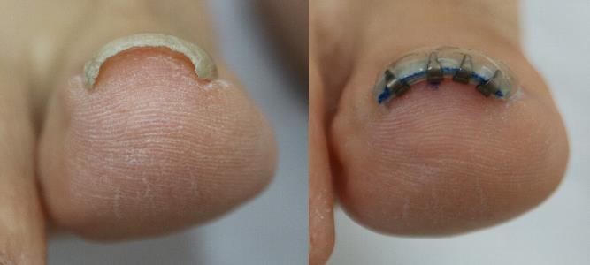 The picture on the right shows the NailLift brace attached and secured in place with a clear gel pedicure. Gel nail polish remains flexible even after hardening, so it will not interfere with the corrective effects of NailLift.